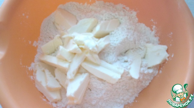 Форму смазываем маслом и раскатываем в корж наше тесто, укладываем в форму, прокалываем вилкой, ставим в разогретую духовку (180 гр) на 20 минут.