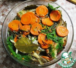 Готовим маринад. Почистить лук и морковь, нарезать кольцами. Вскипятить воду, растворить в ней соль и сахар. Положить лавровый лист, перец, морковь. Убавить огонь и дать специям потомиться в маринаде. Снять воду с огня и влить уксус.