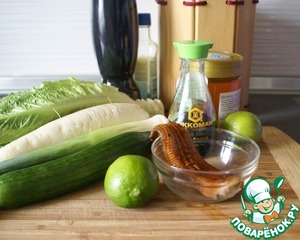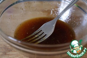 В это время приготовить заправку. Смешать сок одного лайма, ложку оливкового масла, 5 ст. л. соевого соуса лайт и 3 чайные ложки жидкого меда, добавить свежемолотый черный перец, несколько капель кунжутного масла и все энергично взбить вилкой.