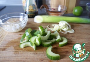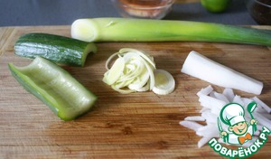 Огурец освободить от семян с помощью чайной ложки. Дайкон нарезать мелкой соломкой, лук-порей - тончайшими колечками.