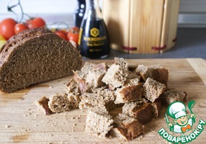 В это время приготовить сухарики. Хлеб нарезать на одинаковые кубики, предварительно срезав корку (по желанию).