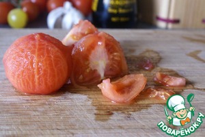 Для заправки я использовала помидоры конкассе. 2 средних помидора ошпарить, снять кожицу и очистить от семян.
