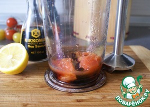 Смешать в блендере мякоть (или сок) помидоров, 3 ст. ложки соевого соуса, сок половинки лимона и чайную ложку оливкового масла.