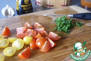 Для самого салата измельчить петрушку и разрезать помидоры черри на половинки.