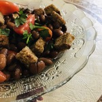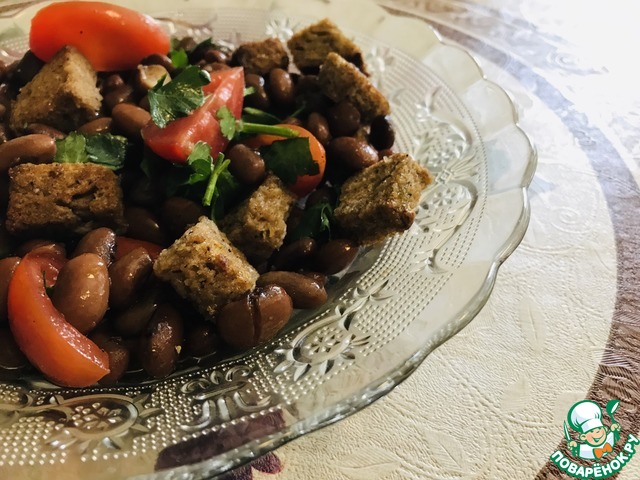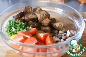 Остывшую фасоль, сухарики, томаты черри и петрушку сложить в глубокую миску, поперчить по вкусу, заправить получившейся заправкой и хорошо перемешать.