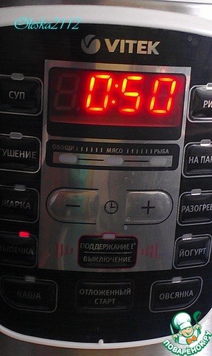 Выставляем режим "Выпечка" время 50 минут. Через 30 минут я открыла крышку чтобы перевернуть пирог, но он был ещё сырой. Потому время выпечки составило ровно 50 минут.