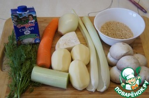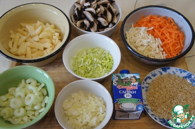 • Морковь и корень сельдерея нашинковать соломкой, репчатую луковицу и порей измельчить. Шампиньоны нарезать тонкими ломтиками. Картофель очистить и нарезать брусочками.
