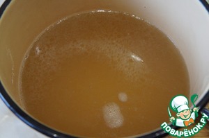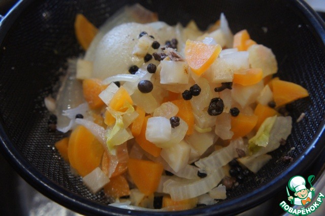• Отварить мясо в 2-х л воды с добавлением моркови, луковицы, корня сельдерея, черного и душистого перца горошком и 2-3 гвоздичек.
