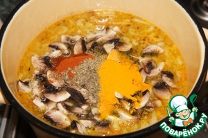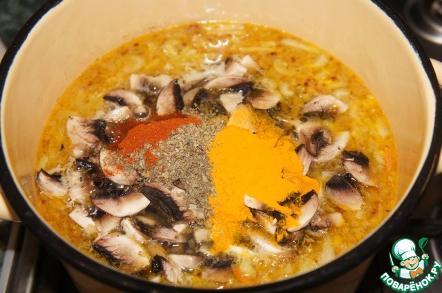• Бульон довести до кипения, всыпать промытый рис, довести до кипения и варить на слабом огне 5 минут. Всыпать картофель и снова довести до кипения. Добавить зажарку, варить 5 минут. Добавить грибы, порей и все специи, варить до готовности.