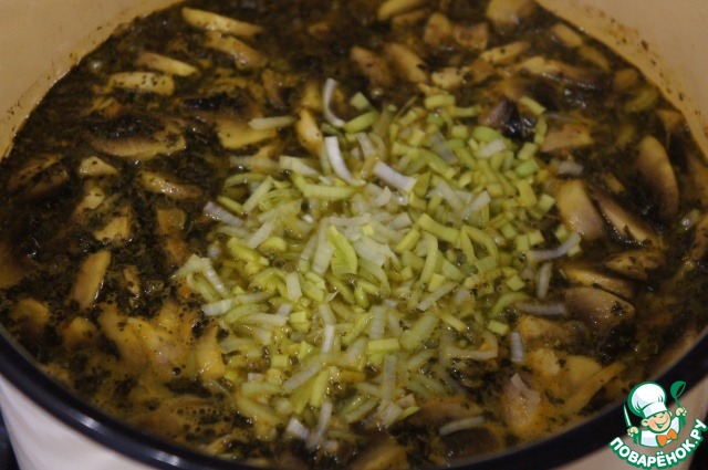 • В самом конце добавить порей, довести до кипения и поварить 1-2 минуты.