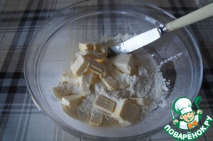 Муку и 150 г сливочного масла растереть руками в однородную крошку.