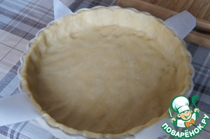 Форму d 24 см смазать маслом, тесто раскатать, выложить в форму и распределить по дну и бокам, оформив высокий бортик. Убрать в холодильник на 1 час.