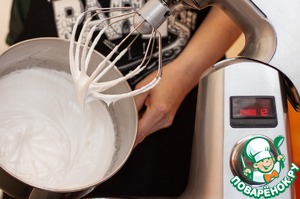 Примерно через 5 минут варки сиропа начинайте взбивать белки. Когда они превратятся в легкую пенку, влейте лимонный сок и взбивайте до мягких пиков. Не прекращая взбивания, влейте тонкой струйкой горячий агаровый сироп и не выключайте миксер еще пару минут, пока не увидите, что масса увеличилась в размере, стала пышной, глянцевой, плотной и блестящей. Вот такой, как на фото. Суфле должно хорошо держать форму.