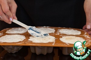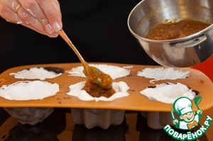 Теперь действуем очень быстро, поскольку агар начинает застывать при 40 градусах. Лопаткой положите в формы суфле, заполняя все пустоты, сделайте выемку, в каждую положите примерно по 1 ст. л. абрикосового желе.
