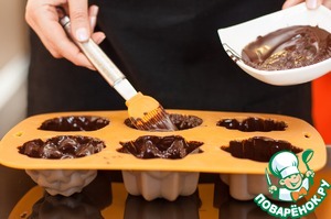 В этом шаге кроется моя основная ошибка - я решила растопить шоколад и смазать силиконовые формы изнутри, остудить в холодильнике, наполнить суфле и достать уже готовое суфле в шоколаде. Я не учла одного - моя силиконовая форма оказалась слишком твердой, чтобы достать десерт без последствий. При последующем охлаждении и попытке его извлечь, шоколадная оболочка нещадно ломалась и пирожные теряли товарный вид. Поэтому мой вам совет - наполните формы суфле, дождитесь его стабилизации, а шоколадом покройте, когда достанете пирожные из форм. Итак, этот шаг пропускаем... хотя, если у вас мягкий и податливый силикон, то можно попробовать приготовить и этим способом, только сделайте слой шоколада потолще.