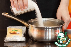Готовим сироп. В кастрюльку влить воду, добавить 1 ч. л. агар-агара и оставить для набухания на 15 минут. Затем всыпать сахар и проварить при слабом кипении, не перемешивая, до загустения и состояния тягучей нитки. Когда вы поднимите ложку с сиропом, он должен стекать непрерывной тонкой струйкой. Но не переварите, иначе сироп загустеет и вам будет сложно вмешать его в белки. У меня это заняло минут семь. Внимание! Время может варьироваться в зависимости от толщины стенок кастрюли, ее объема и температуры нагревания. Еще раз повторяю - мешать не надо, иначе сироп станет мутным и может кристаллизоваться.