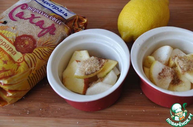 Берём формочки для запекания, на дно наливаем воды (чтобы только покрыла), кладём порезанные яблоки и груши, поливаем соком лимона, посыпаем корицею и сахаром коричневым Демерара от "Мистраль" (1 ст. ложка). -