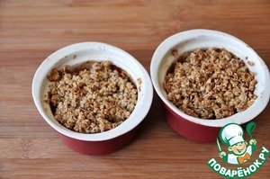 Достаём формочки из духовки, снимаем фольгу и кладём сверху фруктов масляную "крошку".