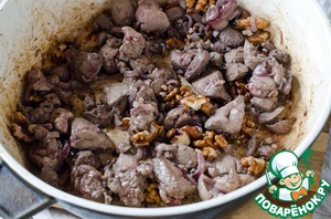 Лук, у меня красный, очистить и мелко нарезать. Обжарить его в сотейнике на сливочном масле в течение 5 минут, добавить к нему печень и готовить 3-4 минуты. Затем положить в печень орехи и готовить еще 3 минуты, влить соевый соус и слегка уварить. Снять с огня.