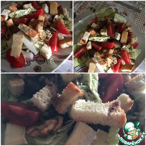 Помидоры черри нарезать на четвертинки, пекинскую капусту порвать руками на кусочки. На тарелки уложить печень, помидоры черри, сыр, кусочки пекинской капусты, посыпать крутонами и заправить салатным соусом Kikoman с луком.