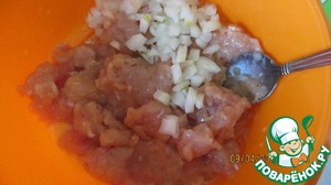 В куриный фарш, добавляем яйцо, мелко нарезанный лук, помешать.