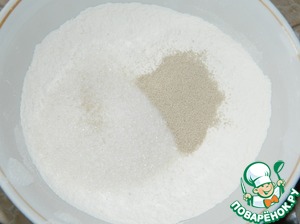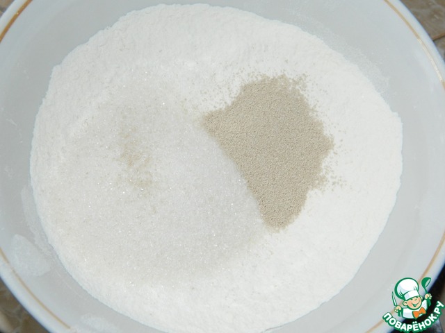 Соединить муку с сахаром и дрожжами.