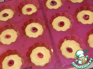 Остывшее тесто выложить в формочки, положить по ягодке. Выпекать при 180С 15-20 минут.