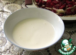 Теперь нам осталось сделать заливку! Для этого смешиваем яйца, 220 мл "Снежка" и крахмал.