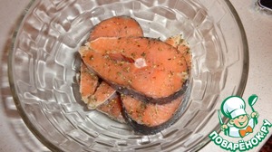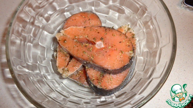 Каждый стейк солим, перчим, посыпаем розмарином и приправой к рыбе.