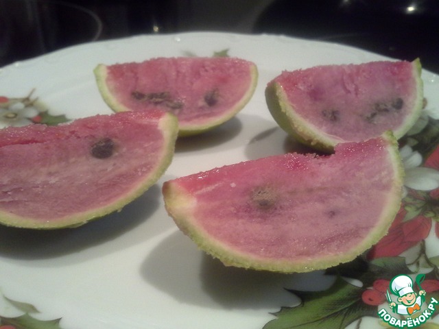 "Сейчас совсем не сезон арбузов!", - скажите вы и будете абсолютно правы! "Не беда!", - отвечу я вам, - "ведь если у вас найдется совсем небольшой набор продуктов, вы можете сделать свой арбуз, с богатым вкусовым многообразием." Угощайтесь!