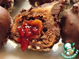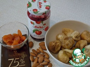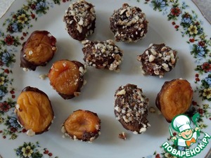• Инжир и курагу залить горячей водой на 10 - 15 мин. Вынуть и обсушить на полотенце. Затем заполнить каждое отверстие в кураге вишневым конфитюром. Миндаль смолоть в крошку. Шоколад поломать на куски, добавить воды и растопить шоколад. Окунуть курагу сначала с одной стороны в шоколад и посыпать миндалем, поставить в морозилку на 5 мин. За это время шоколад застынет. Вынимаем и окунаем второй стороной в шоколад и посыпаем орехами. Снова на 5-10 мин. в морозилку.