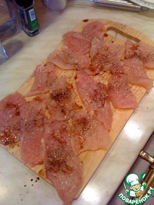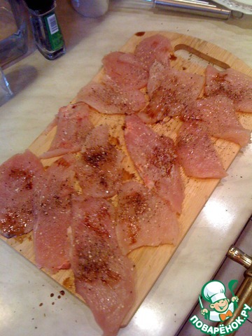 Грудки посолить, поперчить, добавить бальзамический уксус и масло (буквально несколько капель), оставить мясо мариноваться минут на 15