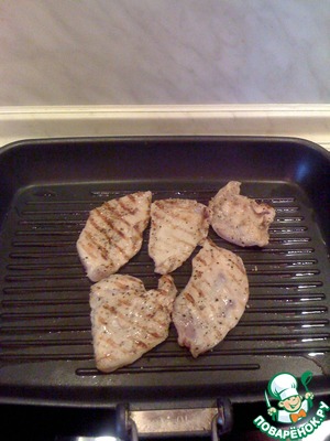 Разогреть сковороду гриль на сильном огне, по желанию добавить немного масла, обжаривать грудки по минуте с каждой стороны