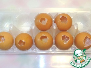 Затем у яиц с тупого конца сделать небольшое отверстие, Ф ~ 2см. Вылить содержимое яиц, промыть внутри теплой водой и высушить.