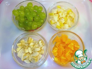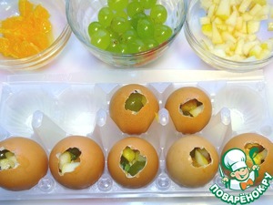 Для заполнения яиц я взяла 1/2 банана, 1 грушу, 2 мандарина и мелкий виноград, фрукты и ягоды можно взять любые, но желательно свежие. Очищенные банан, мандарины и грушу (не очищала) мелко порезать небольшими кусочками.