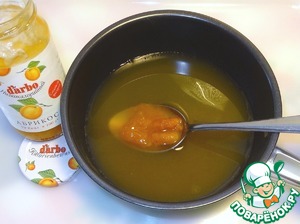 Наливаем в кастрюльку 150 мл воды, добавляем 5-7 ст. л. конфитюра, хорошо размешиваем и ставим на плиту, доводим до кипения и выключаем огонь.