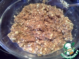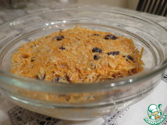 Морковь немного остужаем и смешиваем со всеми остальными продуктами. Получается густая масса.