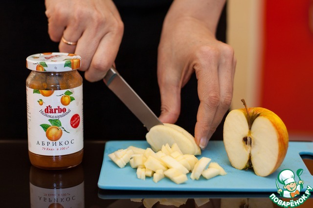 • Яблоко очистить и нарезать кубиком. Поскольку сахар мы не используем вообще, то в качестве сладкой составляющей возьмем низкокалорийный конфитюр d'arbo.