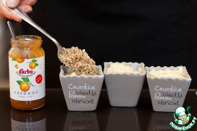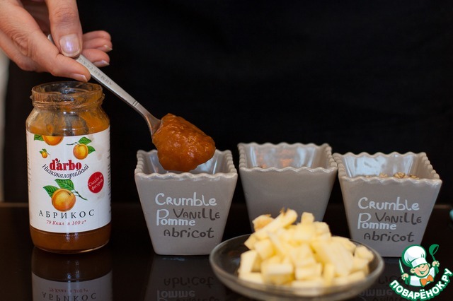 • Затем ложку абрикосового конфитюра, нарезанное яблоко