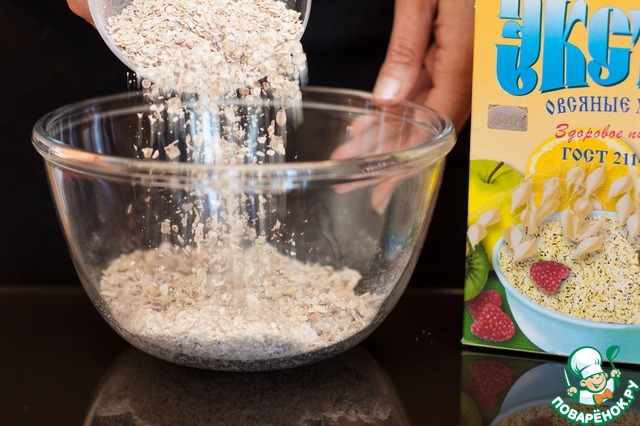 • Всыпать мелкодробленные овсяные хлопья и влить растительное масло. Перемешать. Масса должна быть рассыпчатой, но увлажненной маслом.