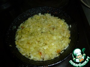 Мелко нарезанный лук выкладываем на сковороду с подогретым растительным маслом и пассеруем его в течение 5-7 минут; доводим до светло-золотистого цвета. Морковь не добавляем, она уже присутствует в капусте.