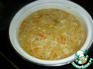 В кастрюлю с кипящей водой или овощным бульоном (1,7-2 л) закладываем коренья и мелко нарезанный картофель. Кладем его в первую очередь потому, что, если положить его после капусты, в кислой среде картофель не разварится.