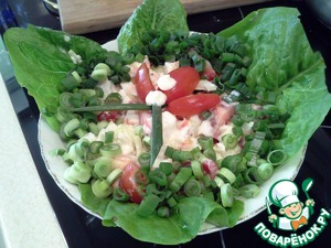 Выкладываем в салатник на листья салата, обильно посыпаем зеленым лучком.