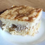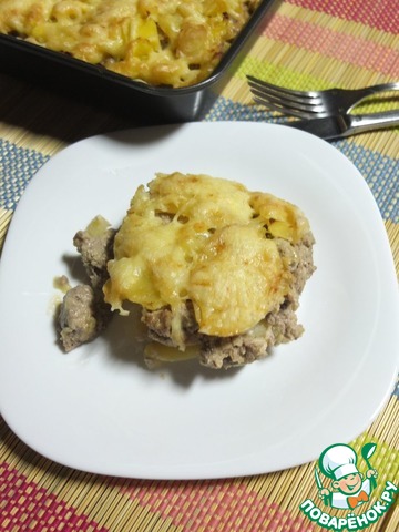 из изменений - заменила сливки разбавленной сметаной (ну, не водятся у меня в холодильнике сливки) и грибочки (свежие) предварительно поджарила, ах да, картошку, которая пошла на верхний слой - потерла на крупной терке (чтоб наверняка пропеклось)