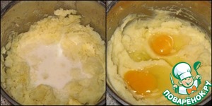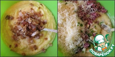 В густое картофельное пюре аккуратно вмешать обжаренный бекон, колбасу, зеленый лук, и сыр, добавить черный молотый перец по вкусу и щепотку тертого мускатного ореха.