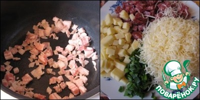 В мультиварке включить режим "Жарка", время - 15 минут. Подрумянить нарезанный бекон. Пока бекон обжаривается, нарезать кубиками моцареллу и колбасу, натереть на мелкой терке пармезан, нарезать зеленый лук.
