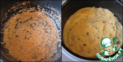 Чашу мультиварки обсыпать панировочными сухарями (2 ст. л.). Смазывать чашу не нужно, т. к. в ней остается жир после обжаривания бекона.