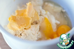 Творог протереть через сито. Соединить с яйцами, сахаром, сливочным маслом комнатной температуры, молоком.