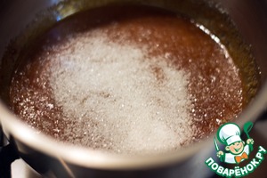 В толстостенной посуде нагреть сахар, наклоняя посуду в разные стороны расплавить сахар до карамельного/янтарного цвета.