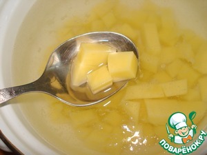 Кастрюлю с мясным бульоном 1,5 литра (или водой) ставим на плиту, кладем в бульон нарезанный картофель.